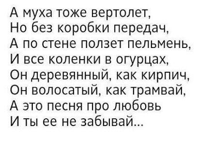 А Муха Тоже Вертолёт Но без Коробки Передач а по Стене Ползёт Пельмень и все Коленки в Огурцах